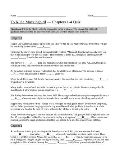 To Kill A Mockingbird Chapter 1 Reading Quiz To Kill A Mockingbird Quiz Chapter from i.pinimg.com Test yourself with our quiz! They offer him hot fry bread. In chapter 6 on dill's last night before returning to meridian, dill and jem have a plan they attempt to carry out under the cover of darkness. They offer two indian head pennies. What is tom robinson accused of in to kill a mockingbird by harper lee?, how old was harper l. May 29, 2015 · to kill a mockingbird is a modern classic, loved by bookworms around the globe, but how well do you know the characters and plot? Unfortunately, lee died while the movie was filming, so harper gave peck his watch and chain. To kill a mockingbird quiz 10 question trivia quiz, authored by ken1260